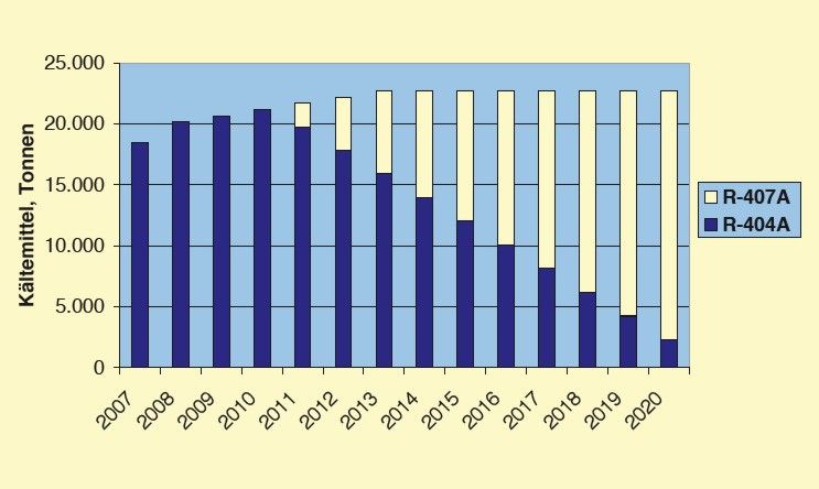 Obwohl R 404A auch in der Transportkühlung eingesetzt wird, ist sein vorwiegender Einsatz in der Gewerbekühlung. Wenn 90 % des eingesetzten R 404A innerhalb von zehn Jahren durch R 407A ersetzt werden könnten, ergäbe sich eine beträchtliche Reduktion der Menge der GWP-gewichteten Tonnen von HFKW in der Gewerbekälte.