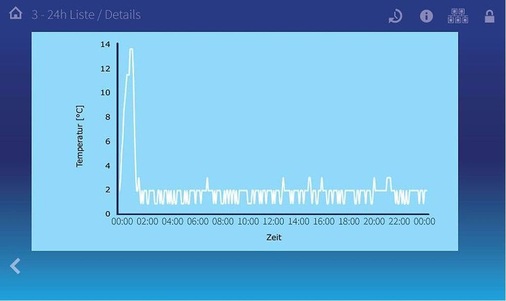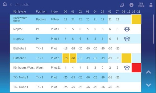 Bei Anzeigen mit vielen Werten wie bei den 24-Stunden-Temperaturlisten löst eine Akkordeon-Navigation den Spagat zwischen einer großen Fülle an Informationen und der optimalen Ausnutzung der Displayfläche. Die stündlichen Mittelwerte können für Zeitfenster von je 8 h aufgeklappt werden. So ist es z. B. dem Marktleiter möglich, sehr schnell problematische Betriebszustände zu identifizieren. Kritische Temperaturen und Abtauereignisse werden farblich und mit Icons hervorgehoben.