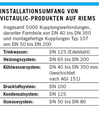 Die Rohrleitungslösung von Victaulic wurde darüber hinaus in Trinkwasserleitungen, bei der Kaltwasser- und Kühlwassererzeugung und in Heiz- und Kondensatleitungen der Heiz- und Dampfkesselanlage installiert. Außerdem sind die Kupplungen des in der Umkehrosmoseanlage zur Wasseraufbereitung verbaut.