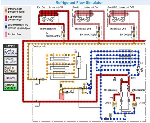 Der Einsatzbereich der VRV CO 2 liegt bei der Betriebsart Kühlen zwischen 43 °C und 5 °C. Bei einer Außentemperatur zwischen 5 °C und 20 °C müssen mindestens 70 Prozent der Innengeräte laufen, damit ein normaler Betrieb gewährleistet werden kann. Im Heizbetrieb ist ein normaler Betrieb bei Außentemperaturen von 20 °C bis 25 °C gesichert.