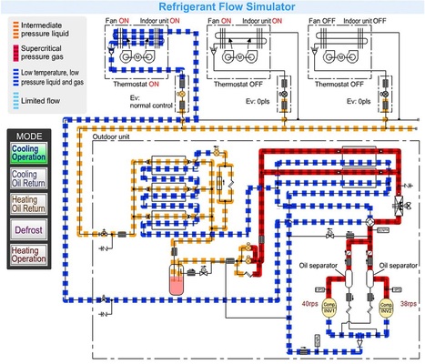 Die VRV CO 2 wurde mit einem neuen optimierten Kältekreislauf ausgestattet, der aus einem zweistufigen Unterkühlerkreislauf sowie einem Gaskühler besteht, der eine maximale Wärmeübertragung zwischen dem CO 2 Gas und der Außenluft gewährleistet. Zusätzlich wurde die Rohrdimension im Vergleich zu den R 410 A-VRV-Systemen verkleinert.