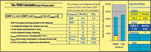 Wie eingangs erwähnt, unterscheidet sich die VRV-CO 2 -Anlage zur R 410 A-VRV-Anlage auch in der energetischen Effizienz. Die VRV-CO 2 -Anlage hat vor allem im Heizbetrieb ihre Stärke, dort liegt der COP bei 3, während der EER in der Betriebsart Kühlen bei 2 liegt. Bei einer ausgewogenen Jahresverteilung der Betriebsarten (Kühlen 50 Prozent und Heizen 50 Prozent) liegt die Leistungszahl folglich bei 2,5. Die R 410 A-VRV-Anlage weist dagegen eine durchschnittliche Leistungszahl von 3,6 auf. Beide Berechnungen beziehen sich auf eine Betriebsdauer von 15 Jahren. Betrachtet man die CO 2 -Emissionen (indirekte, direkte und Stromverbrauch) beider Anlagen über diesen Zeitraum, so zeigt sich, dass auch hier die R 410 A-VRV-Anlage mit insgesamt 161 948 t besser abschneidet als die VRV-CO 2 -Anlage mit insgesamt 177 746 t. Dies liegt vor allem an dem höheren Stromverbrauch des VRV-CO 2 -Systems. Steigt der Anteil der erneuerbaren Energien am Strommix in den nächsten Jahren, so verbessert sich auch die CO 2 -Bilanz des VRV-Systems.