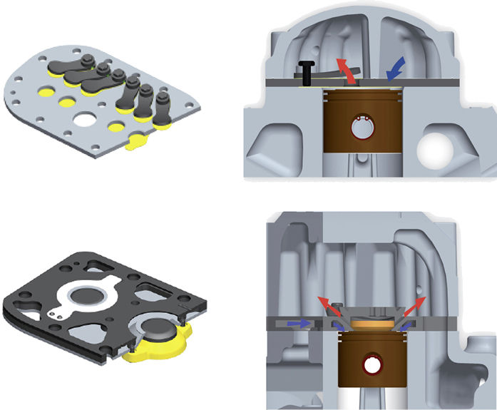 Die Discus-Ventiltechnologie ist der wesentliche Unterschied zwischen Stream- und anderen Hubkolbenverdichtern. Der Name stammt vom konischen Design des Druckventils. Geschlossen ist es bündig mit der Ventilplatte, wodurch der Schadraum minimal ist, wenn sich der Kolben in oberster Position befindet (Bild 4). Bei konventionellen Verdichtern verhindert ein Zungenventil, dass der Kolben dem Zylinderkopf zu nahekommt, was aber zusätzlichen Schadraum bedeutet. Dabei ergeben sich die folgenden Verluste: