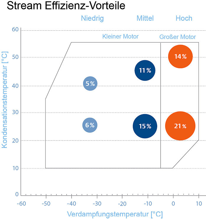 Bei der Discus-Ventiltechnik reduzieren sich die Druckverluste mit größerem Ventildesign. Da das Ventil in die Ventilplatte integriert ist, gibt es auch kein rückströmendes Gas. So ist die maximale Ventilgröße nur abhängig von der Ventilplatte. Ein Optimum wird also unabhängig von Kältemittel und Betriebsbedingungen erreicht. Einen Kompromiss gibt es mit Stream-Verdichtern nicht.