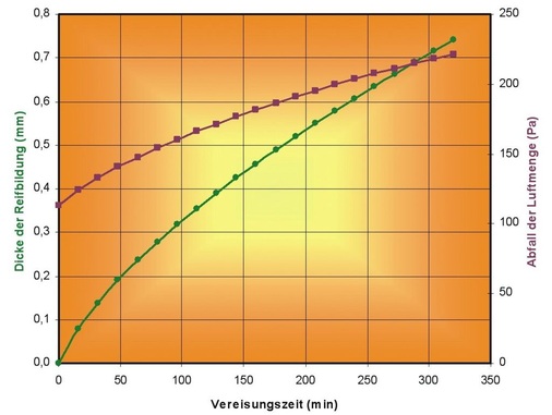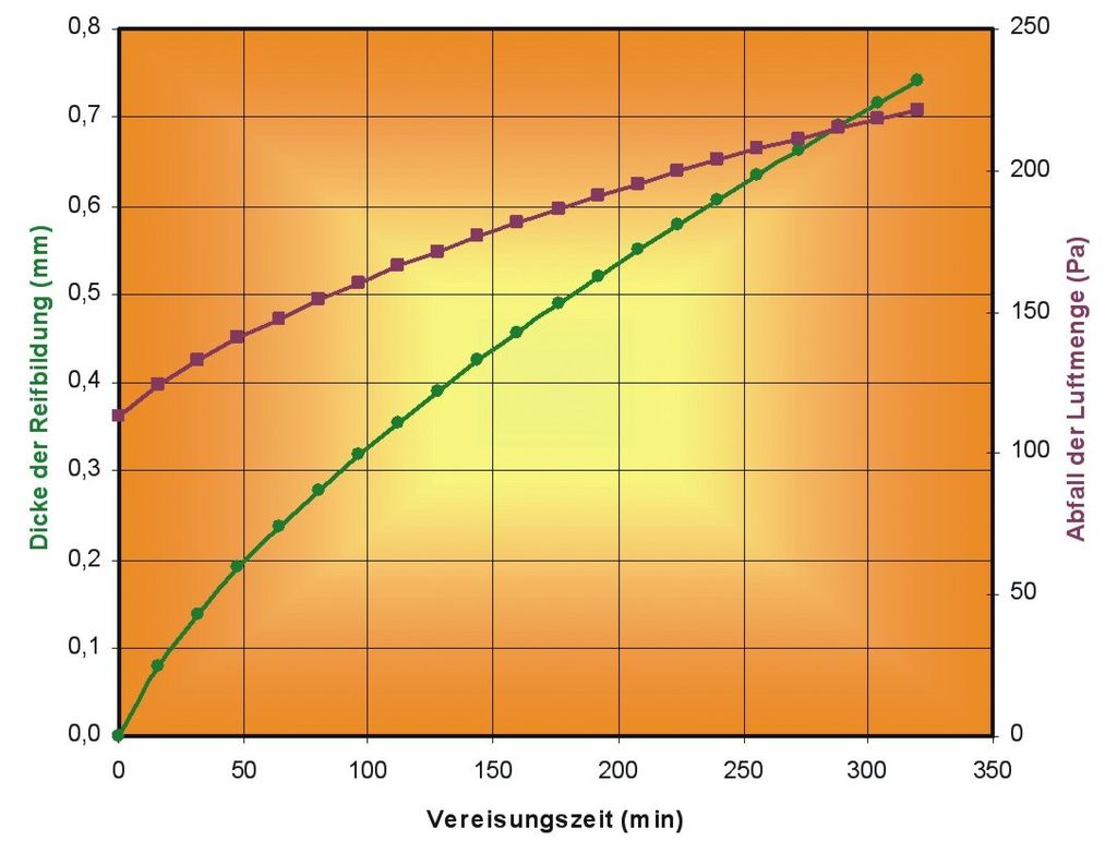 Das Bild 2 zur Vereisungszeit zeigt den Aufbau der Reifschicht auf den Lamellen und den damit verbundenen Anstieg des Strömungswiderstands des Lamellenpakets, ebenfalls abhängig von der Vereisungszeit.