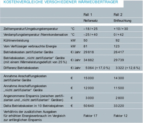 Durch Leistungstests in unabhängigen Fachlabors, wie z.B. durch den TÜV, können die Hersteller ihre Produkte mit der Verpflichtung zertifizieren, dass die Abweichung zwischen den Katalogdaten und den effektiven Daten nicht mehr als 8 % beträgt. Die Zahlenbeispiele machen klar, was passiert, wenn man sich bei der Auswahl auf zu groß-zügig angegebe Daten stützt: Wenn man einen 20 % niedrigeren Einkaufspreis zertifizierter Geräte im Vergleich zu nicht zertifizierten Geräten annimmt, so entstehen bei den Beispielen Mehrkosten, wie sie detailliert in der Tabelle Kostenvergleich dargestellt sind.