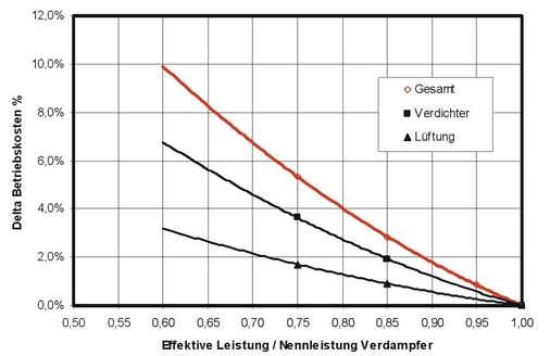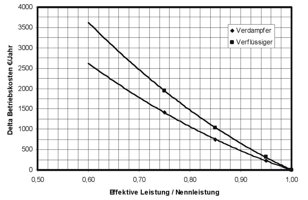 Über Bild 3 lassen sich höhere jährliche Betriebskosten bei Leistungsdefiziten gegenüber den Nennwerten im Katalog ablesen. Betrachtet man auf der Abszisse den Wert 0,75, bekommt man auf der Ordinate für den Verflüssiger einen Wert von 3300 €/a, bei einem Verdampfer mit 25 % Leistungsdefizit hätte man eine Betriebskostenerhöhung von 1950 €/a. Hinsichtlich der Betriebskostenerhöhung bei gleichem prozentualen Leistungsabfall reagiert der Verflüssiger also sensibler als der Verdampfer.