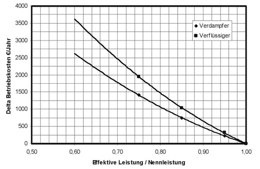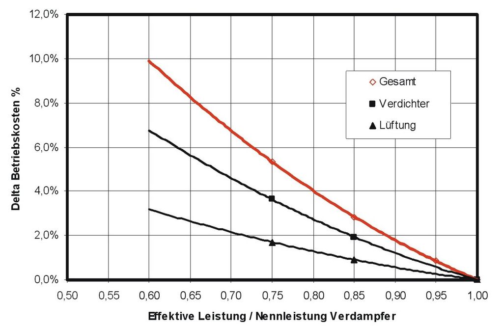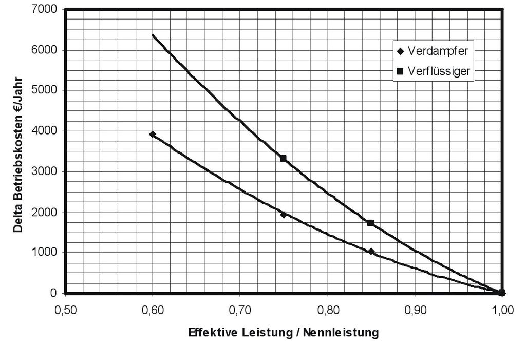 Zu Punkt E, Zunahme der jährlichen Mehrkosten: Wenn man den gestiegenen Energieverbrauch betrachtet und diesen mit den Katalognenndaten des Verdampfers vergleicht, stellt man eine unterschiedliche Entwicklung bezüglich des Verhältnisses effektive Leistung zur Nennleistung fest.