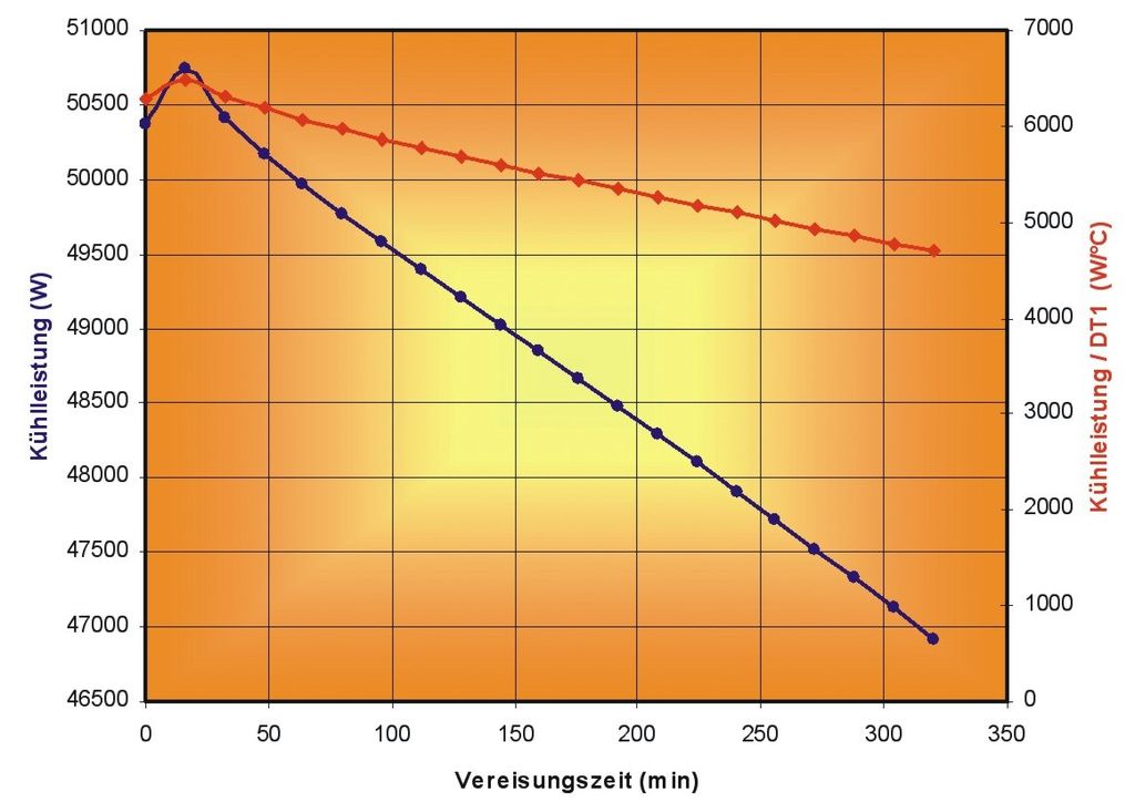 Bild 1 zeigt hierzu den Verlauf der Kühlleistung und vergleicht diesen mit dem Verhältnis zwischen Kühlleistung und DT1, der Differenz zwischen der Zellentemperatur und der Verdampfungstemperatur, abhängig von der Vereisungszeit.
