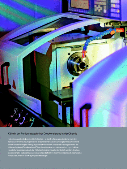 Werkzeuge halten länger, Bearbeitungszyklen werden kürzer, die Bauteilgenauigkeit steigt. Das sind Effekte, die durch Kälteanwendung in Produktionsprozessen erreicht werden. Aber auch Druckmaschinen laufen schneller oder chemische Prozesse werden überhaupt erst möglich, wenn Kälte zur Verfügung steht. Die Anwendung von künstlicher Kälte in Produktionsprozessen ist in einem weiten Bogen gespannt. Einen Einblick in diese vielfältigen und nur wenig miteinander verknüpften Anwendungen zu geben, war das Ziel des Symposiums mit dem Titel Thermische Stabilisierung von Produktionsprozessen mit Kältemaschinen, das vom TWK Karlsruhe in Verbindung mit dem Institut für Fertigungstechnik und Produktion der Hochschule Karlsruhe am 18. September 2008 durchgeführt wurde. Namhafte Referenten aus den genannten Bereichen legten den neuesten Stand der Entwicklung und die Perspektive der Kälteanwendung dar.