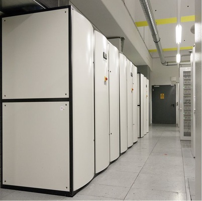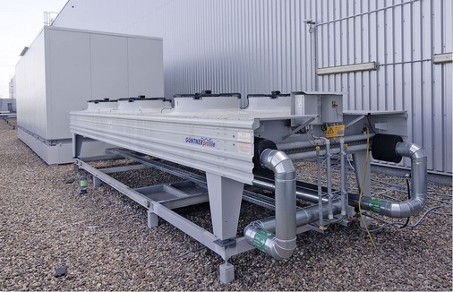 Im Frühjahr 2013 wurden zunächst alle umfangreichen vorbereitenden Arbeiten am Kaltwassernetz, zu denen auch die Dachinstallation von zwei neuen Kaltwassererzeugern gehörte, von einer ortsansässigen Firma durchgeführt. Dort oben sollten künftig zur Rückkühlung bzw. für den Einsatz einer freien Kühlung in den Übergangs- und Wintermonaten außerdem sechs Güntner-Kühler Dienst schieben. Schließlich wurden der 100 m 2 große Serverraum mit den Serverschränken für Automatisierung und der kompletten Robotersteuerung sowie auch die Zentrale der unterbrechungsfreien Stromversorgung (USV-Raum, circa 30 m 2 ) bestückt. Da diesaber im laufenden Betrieb zu geschehen hatte und Kälte daher immer verfügbar sein musste, war eine exakte Planung nötig. Als zusätzliche Vorsichtsmaßnahme fand der Umbau in den Wintermonaten statt, da während dieser Zeit nahezu keine äußeren Lasten zu erwarten waren.