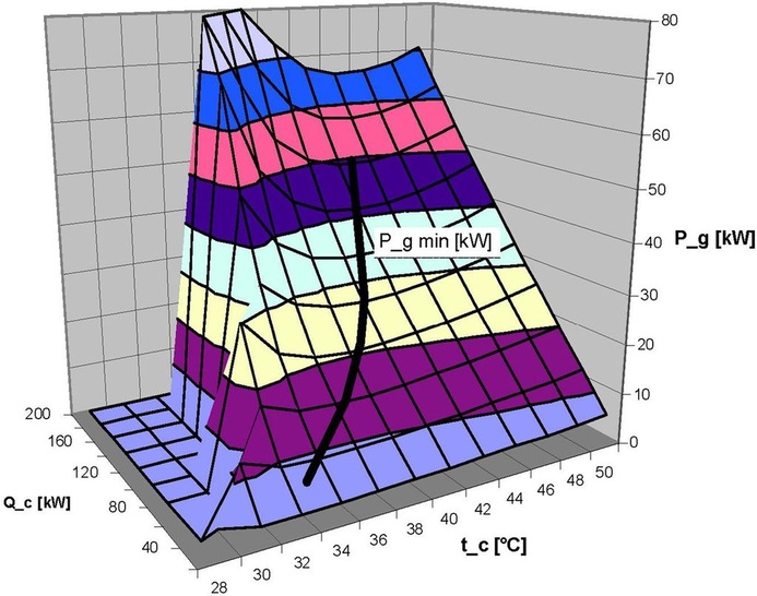 Die optimale Vorgehensweise zur Minimierung des Gesamtwertes der elektrischen Leistungsaufnahme einer Kälteanlage erfordert das Ermitteln des energetisch günstigsten Betriebspunktes, an dem die Summe aus der Verdichterantriebsleistung und der Leistungsaufnahme der Verflüssigerventilatoren einen Minimalwert erreicht. Dass es überhaupt ein solches Minimum gibt, liegt in der Tatsache begründet, dass die Leistungsaufnahme von Ventilatoren wie bei allen Strömungsmaschinen mit der dritten Potenz der Drehzahl wächst, der Luftvolumenstrom und somit in grober Näherung auch die thermische Leistung sich aber linear mit der Drehzahl erhöhen.