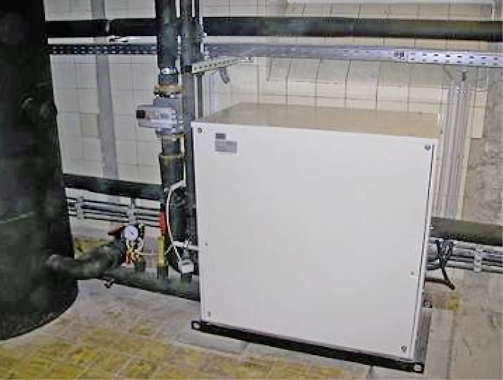 Der vorhandene Tomograph hat einen eigenen Stickstoff-Kühlkreislauf. Da der Stickstoff im Bereich von 20 °C verdampft, wird über die Kühlung sichergestellt, dass dieser Grenzbereich nicht überschritten wird, um jederzeit voll funktionsfähig zu sein. Die Kühlung des Stickstoffkreislaufes erfolgt über einen 1000-Liter-Pufferspeicher, der über das Kaltwassermodul SGP-WE170M1 mit 50 kW Kühlleistung (Bild 5) gespeist wird. Dies garantiert, dass vor allem im Betrieb des Tomographen immer genügend Kühlleistung abrufbar ist, denn dort ent-steht kurzfristig eine Wärmelast von bis zu 100 kW, die abgeführt werden muss. Über eine Direktverdampfung ohne den zwischengeschalteten Wasserkreislauf wäre dies nicht gewährleistet.