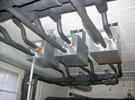 Das dritte System versorgt Teile des dritten und vierten Obergeschosses sowie das ausgebaute Dachgeschoss mit 13 VRF-Wandgeräten. Da die Räumlichkeiten vermietet sind, erlaubt dieses System einen völlig unabhängigen Betrieb innerhalb des Gebäudes. Die Wahl fiel hier auf ein 2-Way-System, da dieser Gebäudetrakt als Bürofläche genutzt wird und nur entweder gekühlt oder beheizt wird.