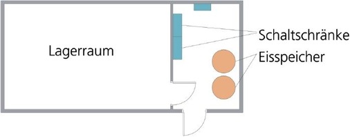 Der Kühlraum hat eine Grundfläche von 4 x 8 Meter und ein Volumen von etwa 100 m³, ist in Sandwichelement-Bauweise ausgeführt und in einen Vorraum und den eigentlichen Kühlraum gegliedert. Der Vorraum beherbergt die gesamte Hydraulik des LT-Kreises (Pumpe, Ventile etc.), die Eisspeicher und die Schaltschränke für die Messdatenerfassung und Regelung.