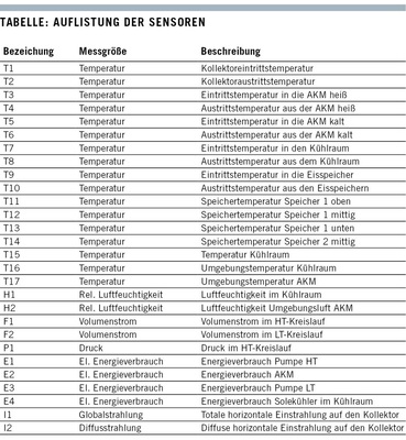 Die Pilotanlage ist mit umfangreicher Sensorik ausgestattet, mit deren Hilfe der Betrieb überwacht und gesteuert wird. Alle Sensoren werden in einem Zeitintervall von 3 s ausgelesen und die Daten lokal gespeichert. Die gesammelten Messdaten werden einmal pro Tag automatisch an das Fraunhofer ISE gesendet und dort ausgewertet. Zudem stellt ein Teil der Sensoren die Grundlage für die automatische Steuerung der Pilotanlage dar.