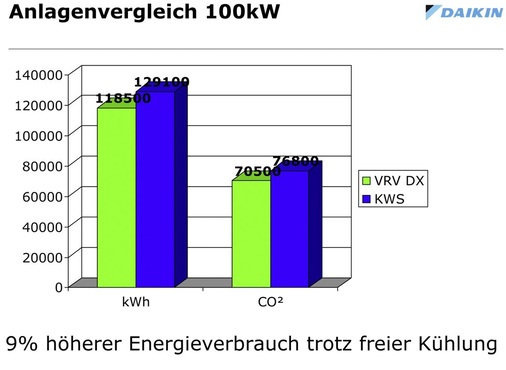 - Bei einer Kälteleistung von 100 kW und 7 000 Betriebsstunden pro Jahr sind der Energieverbrauch sowie die CO 2 -Emissionen bei den Kaltwassersätzen trotz Freier Kühlung um bis zu neun Prozent höher als bei der VRV mit Direktverdampfung.