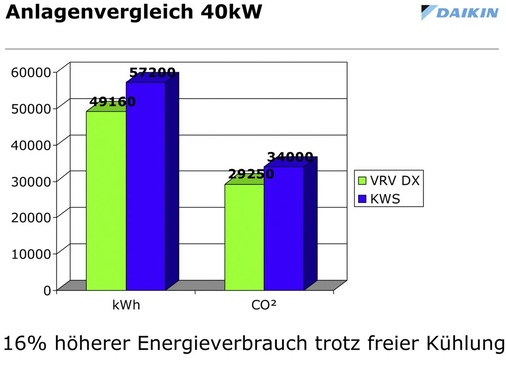 Begründen lässt sich das durch den besseren Wirkungsgrad der VRV-Anlage. Obwohl bei einem Kaltwassersatz mit Freier Kühlung ab einer Außentemperatur unter 5 °C nur der Rückkühler in Betrieb ist und nur Pumpen und Ventilatoren zur Bereitstellung der Kälteleistung benötigt werden, schneidet das System über das gesamte Jahr gesehen schlechter ab als die VRV-Anlage.