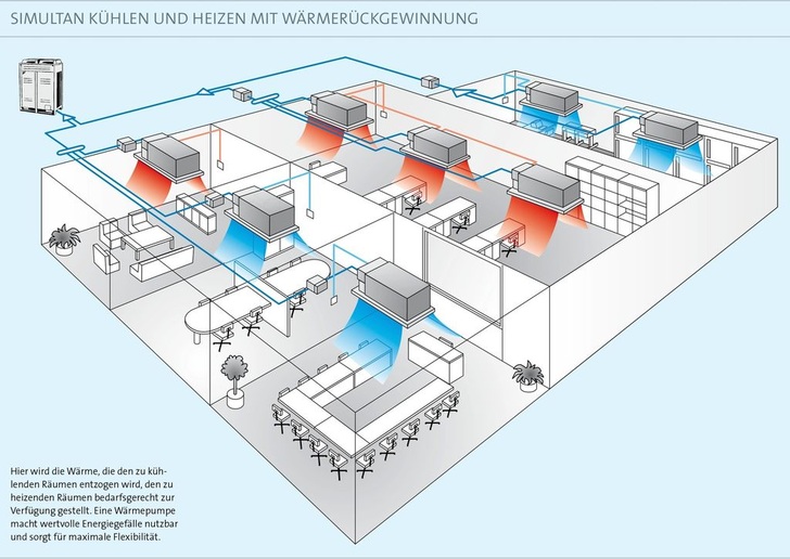 Auch die Effizienz im Rechenzentrum braucht bei Verwendung einer VRVAnlage nicht zu leiden. Es besteht die Möglichkeit, auch Klimaschränke und externe Kühlregister mit Kälte zu versorgen. Noch weniger CO 2 entsteht, wenn die Abwärme aus den Rechenzentren und Serverräumen zum Heizen genutzt wird. So lässt sich zum Beispiel über eine VRV mit Wärmerückgewinnung gewonnene Wärme zum Heizen in die Büroräume verschieben. Dieses Beispiel gilt natürlich nicht für alle Anwendungsfälle. Dennoch lohnt es sich auch andere Kühlsysteme in Erwägung zu ziehen und sich nicht allein durch den Begriff Freie Kühlung blenden zu lassen. -