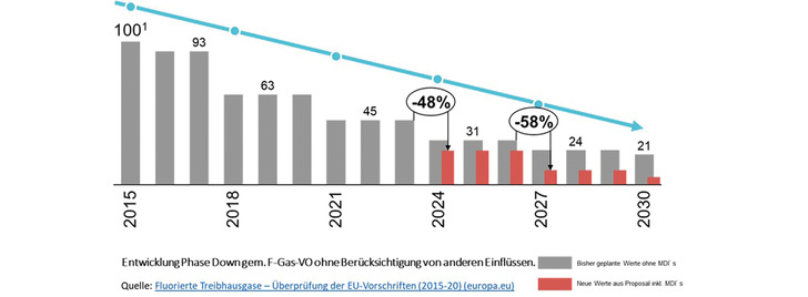 Der Phase Down wird stark beschleunigt und erhält ab 2024 neue, noch weiter reduzierte Quoten. So soll bis 2030 die Quote auf 5,7 Prozent reduziert werden, statt der bisher geplanten 21 Prozent aus der aktuell gültigen Verordnung. Geplant ist der verschärfte Phase Down ab 2024 mit einer Quote von 23,6 Prozent (vorher 31 Prozent). In der Praxis wäre das eine Reduzierung um 48 Prozent gegenüber dem Vorjahr.