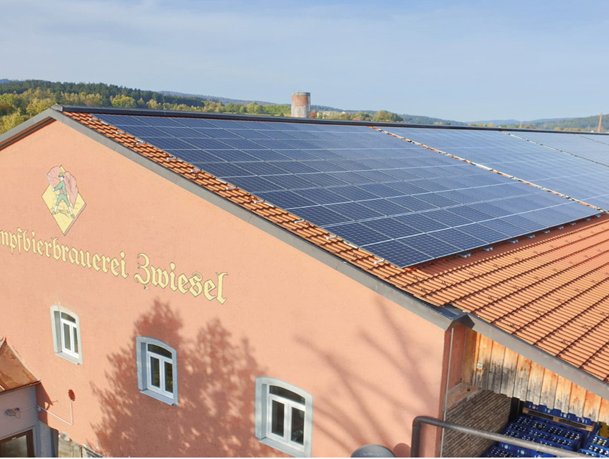 Im Juni 2020 wird eine PV-Anlage mit 84 kWp auf dem Brauereihauptgebäude in Betrieb genommen. Durch die PV-Anlage wird der Netzbezug um weiter 60MWh/a gesenkt, zusätzlich findet eine Einspeisung von 15 bis 20 MWh/a statt. Die sinkende Einspeisevergütung und die EEG-Umlage legen eine Maximierung der Eigenstromnutzung nahe. Mit dem bestehenden Trane Roggenkamp Equipment wird 2021 eine PV-Überschussregelung umgesetzt bzw. die bestehende Regellogik erweitert. Tagsüber ist eine Leistungssteigerung der Kältemaschine ohne zusätzlichen Strom aus dem Netz möglich. Überschüsse werden über die leistungsgeregelte Kältemaschine abgeleitet und die Lagerkeller dienen hierbei als thermische Batterie – die Bierbatterie.