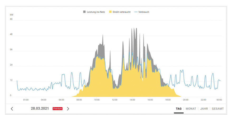 Unter Betrachtung der Energieeinsparung von 32,8 MWh/a, der Eigenstromnutzung von etwa 60 MW/a und der erweiterten Eigenstromnutzung durch die Überschussregelung von 15 MW/a reduziert sich der Strombezug vom Netz von 211 583 kWh/a auf 103 783 kWh/a. Das Resultat: Eine Halbierung des Gesamtstrombezugs vom Netz.