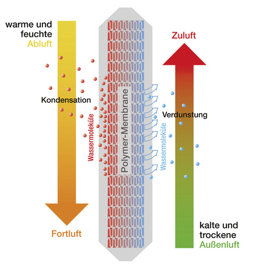 Die dezentralen Lüftungsgeräte KWL Yoga von Helios Ventilatoren sind auch mit einem Enthalpie-Wärmetauscher erhältlich. Neben der Wärmerückgewinnung bietet dieser eine hygienische Feuchterückgewinnung, die sowohl in der kalten als auch in der warmen Jahreszeit für eine ideale sorgt. Während im Winter ein Großteil der Feuchtigkeit aus der Abluft an den frischen Zuluftstrom übertragen und hierdurch eine zu trockene Raumluft verhindert wird, funktioniert die Feuchteübertragung im Sommer genau umgekehrt. Vor allem an schwülwarmen Tagen entzieht hier der Wärmetauscher einen Teil der Luftfeuchte aus der Außenluft und überträgt diese direkt auf die Fortluftseite. Das KWL Yoga-Sortiment ist VDI 6022 konform und umfasst drei Gerätegrößen von 400 über 700 bis hin zu 1000 m³/h.