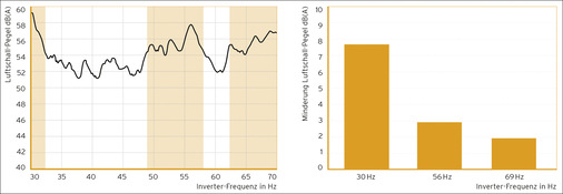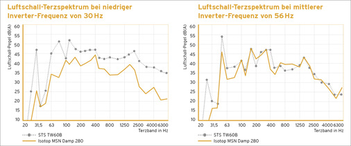 Um die theoretischen Ausführungen zu bestätigen, wurden Messungen durchgeführt. Es galt zu überprüfen, in welchem Ausmaß sich der (primäre) Luftschallpegel durch die Einführung einer optimierten Vibrationsisolierung des Kompressors verbessern lässt. In mehreren Versuchen wurde zuerst der Luftschallpegel im Außenbereich der Anlage in Abhängigkeit der Kompressor-Drehzahl bestimmt. Zu diesem Zweck wurde über den Frequenzumformer im gesamten Einstellbereich von 30 Hz bis 70 Hz kontinuierlich mit 10 Hz/min in der Frequenz gesteigert und dazu Luftschallpegel sowie die Beschleunigungen und Schwinggeschwindigkeiten von Gehäuse und Bodenbelag gemessen. Orange markiert sind die Bereiche besonders hoher Schallabstrahlung. Nach erfolgter Messung erfolgte der Umbau von Gummi-Metall-Lagern zu einer elastischen Lagerung mit Isotop MSN-DAMP. Die erneute Messung des Schallpegels ergab gerade bei niedriger Drehzahl ein erhebliches Verbesserungspotential von rund 8 db(A). Aber auch in allen Bereichen mit hoher Schallabstrahlung lässt sich eine Verbesserung erkennen. Die Ursache für die besonders großen Unterschiede bei geringen Kompressor Drehzahlen liegt darin begründet, dass die Isolierwirkung der mit 10,8 Hz niedrigen Eigenfrequenz des PUR-Lagers deutlich früher wirkt als jene des Gummi-Lagers.