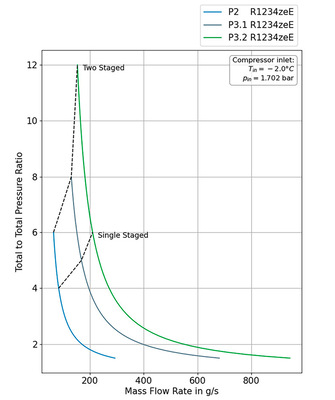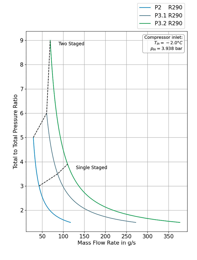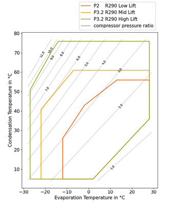 Die Verdichterarchitektur und Verdichterenvelope für R 290 und R 1234z zeigen, wie viele Stufen man für die angestrebte Druckverhältnisse benötigt.