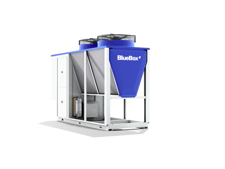 Das Gerät mit dem natürlichen Kältemittel Propan (R290) ist zum Heizen oder Kühlen von Wasser oder Sole konzipiert. Die außen aufgestellte BlueBox Titan Sky leistet im Kühlbetrieb 30-195 kW, als Wärmelieferant 30-175 kW. Ihr SCOP liegt bei bis zu 4,12 (mit optionalen EC-Ventilatoren und Inverterpumpen). Für größere Leistungen können mehrere Einheiten mittels hauseigener Multilogic-Regelung kaskadiert werden. Die Anlage verfügt über einen Inverter-geregelten Hubkolbenverdichter, eine bedarfsabhängige Abtauung und optimierte Steuerung. Ab ca. 100 kW Heizleistung ist die Anlage zweikreisig ausgeführt, sodass sie im Abtaubetrieb weiter heizen kann. Da die Titan Sky sehr kompakt ist (Tiefe 1130 mm), bleibt der einzuhaltende Schutzzonenbereich klein. Im Heizbetrieb ermöglicht sie Vorlauftemperaturen bis 63°C (bei -7°C Außentemperatur). Ihre Einsatzgrenze liegt bei -20°C Außentemperatur.