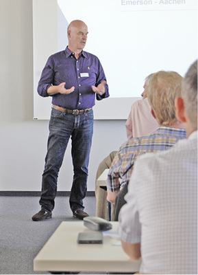 Nach einer kurzen Begrüßung durch Christian Söllner, Verkaufsleiter D-A-CH bei Emerson Climate Technologies, und KK-Chefredakteur Markus Simmert bezieht Dr. Jürgen Süß von efficient energy auf der Bühne Stellung und nimmt mit seinem Vortrag die Lehrer in die Welt des Kältemittels Wasser (R718) mit.