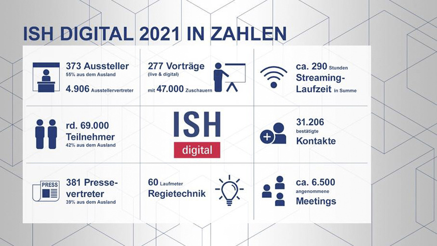Im Zentrum der Veranstaltung standen von Anfang an Vernetzung, Wissensaustausch, hochkarätiger Content, ein umfangreiches Rahmenprogramm sowie neueste Lösungen und Produktinnovationen der Aussteller. Während des Live-Events vom 22. bis 26. März 2021 wurden insgesamt 290 Stunden Content gesendet. Es fanden 277 Live- und Digital-Events statt, die von über 47 000 Zuschauern aufgerufen wurden. Auf der Plattform waren insgesamt rund 69 000 Teilnehmer – davon 42 Prozent aus dem Ausland – aktiv. Ergänzt wurde die Plattform um das ISH Radio mit rund 29 000 Zuhörern.