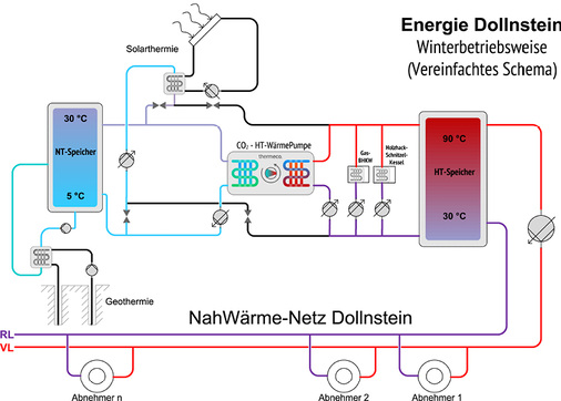 Das Kommunalunternehmen Energie Dollnstein realisiert ein neues Nahwärmenetz mit 45 Nutzern, für das thermea eine Hochtemperaturwärmepumpe thermeco2-HHR 520 geliefert hat. Die Planung lag in den Händen der Fa. Ratiotherm, die ein beispielhaft innovatives Konzept umgesetzt hat. Bild 8 zeigt einen Lageplan und Bild 9 das vereinfachte Funktionsschema mit den Wärmeerzeugern thermeco2-HHR 520, BHKW, Hackschnitzelkessel und Solaranlage, die einen Hochtemperaturspeicher laden. Als Wärmequelle dient Uferfiltrat der Altmühl, die thermisch mit der Abwärme des BHKW, dem Abgas des Hackschnitzelkessels, mit der Solarthermieanlage aufgewertet in einem Niedertemperaturspeicher gepuffert werden kann. Die Nutzung des Hackschnitzelkessels ist auf wenige Stunden bei Spitzenlast im Winter beschränkt.