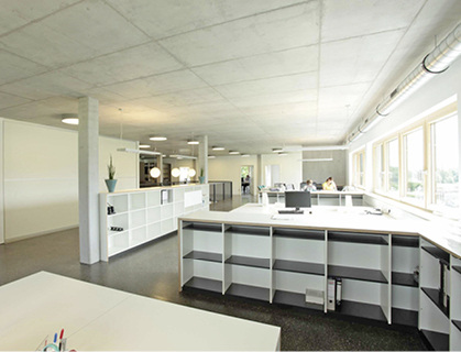 Unterstützt und verstärkt wird dieser Kreislauf durch eine thermische Bauteilaktivierung: In die massiven Betondecken des Verwaltungstrakts ist ein Rohrsystem ähnlich der ebenfalls installierten Fußbodenheizung integriert. So speichern auch die Decken Wärme oder Kälte aus dem durchfließenden Wasser und geben sie gleichmäßig über einen längeren Zeitraum wieder ab. Gerade im Kühlmodus fallen auf diese Weise nur die Stromkosten der Umwälzpumpen an“, erklärt Wölpper das mit Bartl entworfene Technikkonzept. Darüber hinaus lässt sich die Wärmepumpe dank einer sehr niedrigen Vorlauftemperatur von 25 °C für die Betonkernaktivierung und 28 °C für die Fußbodenheizung wirtschaftlich betreiben.