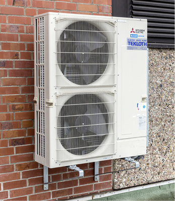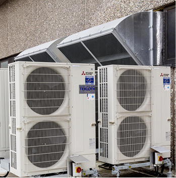 Diese Aufgabe wird von vier Mr. Slim-Außengeräten mit Power-Inverter-Technik übernommen, die eine Kälteleistung von jeweils 12,5 kW haben. Jede Außeneinheit versorgt ein Register der Lüftungsanlage im automatischen Umschaltbetrieb mit Wärme zum Heizen oder Kälte zum Kühlen. Je nach Leistungsanforderung schalten sich die vier Außengeräte nacheinander hinzu, um die Wärmeregister entsprechend zu versorgen.