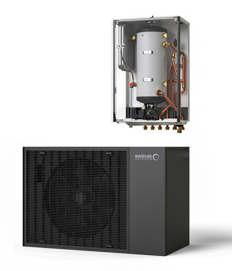 Die Luft-Wasser-Wärmepumpe BLW Mono-P.1 von Brötje verfügt über eine Kühlfunktion, die auf einer Umkehrung des Kältekreislaufs basiert. Ein interner Trennpufferspeicher mit Heizkreispumpe und einem Volumen von knapp 40 l ermöglicht den Kühlbetrieb auch während der Trinkwassererwärmung. Das dafür benötigte Wasser wird vor dem Puffer abgezweigt, wodurch ein energieintensiver Wechselbetrieb zwischen Kühlen und Heizen des Speichervolumens vermieden wird. Die Kühlung erfolgt über die bestehende Heizungsinfrastruktur wie Flächen- oder Fußbodenheizungen mit einer Vorlauftemperatur von circa 18 °C und kann die Raumtemperatur um etwa 3 bis 4 °C senken. Bei einer Außentemperatur von 35 °C erreicht die Anlage eine Energieeffizienzratio (EER) von 4,57. Dies entspricht einer Erzeugung von 4,57 kW Kälteleistung aus 1 kW Strom. Der Kühlbetrieb wird über die IWR-Regelung in Abhängigkeit der Außentemperatur automatisch aktiviert, eine manuelle Steuerung ist ebenfalls möglich. Die Installation der Monoblock-Wärmepumpe ist ohne Kälteschein durchführbar.