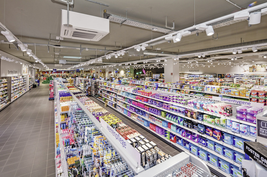 Die Ladenfläche des Drogeriemarktes wird mit sieben 4-Wege-Deckenkassetten klimatisiert. Die 4-Wege-Kassetten wurden gewählt, da sie über einen horizontalen Luftauslass verfügen. Dadurch verteilt sich zum einen die temperierte Luft gleichmäßiger im Raum und zum anderen nehmen Personen keinerlei Zuglufterscheinungen wahr.