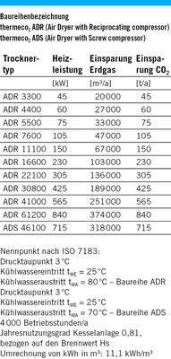Welche Heizleistungen je nach Trocknertyp durch die Entfeuchtung der Druckluft zurückgewonnen werden können, zeigt die folgende Tabelle.