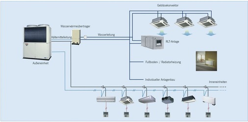 Heizsystem im Gebäude (Inneneinheiten): In der VRF-Standardausführung können bis zu 63 Inneneinheiten je Kältekreis für die Heizung (und/oder Kühlung) von Luft angeschlossen werden. Darüber hinaus besteht die Möglichkeit, Wasser-Wärmeübertrager zuzuschalten bzw. separat (Luft/Wasser-WP) zu betreiben.