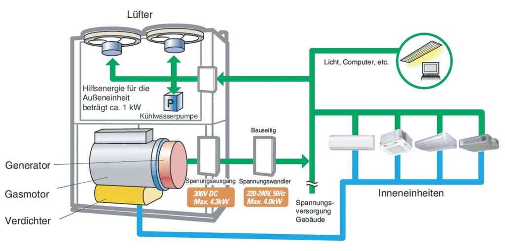 Eine weitere Verbesserung des Primärenergie-Nutzungsgrades ergibt sich durch die Kopplung von Klimatisierung und Stromerzeugung. Dazu werden gasmotorische Außeneinheiten mit einem Generator ausgerüstet, der ca. 4 kW elektrische Leistung liefern kann (Bild 3).