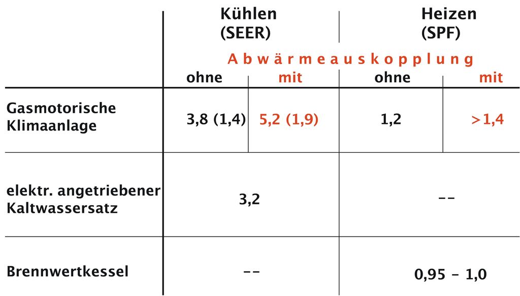 Besondere Bedeutung für die Energieeffizienz der gasmotorischen Klimaanlage/Gasmotor-Wärmepumpe hat die Nutzung der Motor- und Abgasabwärme, nach Möglichkeit über den gesamten Betriebszyklus. Bild 2 zeigt diesen Sachverhalt unter Einbeziehung der Jahresarbeitszahlen verschiedener Systeme.