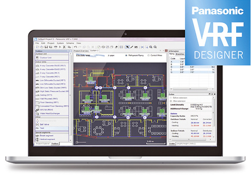 Für die Planung von Systemen mit Gasmotor-Wärmepumpen gibt es von Panasonic als Planungs-Software den VRF-Designer. Damit lassen sich neben den Gasmotor-Wärmepumpen ECO G auch elektrisch basierte VRF-Systeme auslegen und planen. Mit dem Programm können Rohrleitungspläne und automatische Längenberechnungen auf Basis von importierten AutoCAD-Dateien ausgeführt werden. Auf Tastendruck werden ganze Systeme ausgelegt und bemessen, Schaltpläne erstellt und Stücklisten ausgegeben.