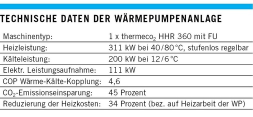 Für die Lösung der Aufgabe wurde der Maschinentyp thermeco 2 HHR 360 in Wasser/Wasser-Ausführung in Zusammenarbeit mit dem Planer ausgewählt. Die Maschine ist mit vier halbhermetischen Hubkolbenverdichtern ausgerüstet, die auf einen hochdruckseitig transkritischen CO 2 -Kreislauf mit innerem Wärmeübertrager arbeitet. Da sich wegen der transkritischen Prozessführung das Kältemittel bei der Wärmeabgabe an das Heizmedium nicht verflüssigt, spricht man nicht von Kondensatoren, sondern von Gaskühlern.