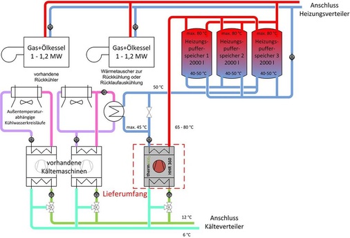 - Bei fehlendem Wärmebedarf ist alternativ reiner Kältemaschinenbetrieb mit vollständiger Rückkühlung möglich. In diesem Fall erfolgt eine Absenkung der Vorlauftemperatur.