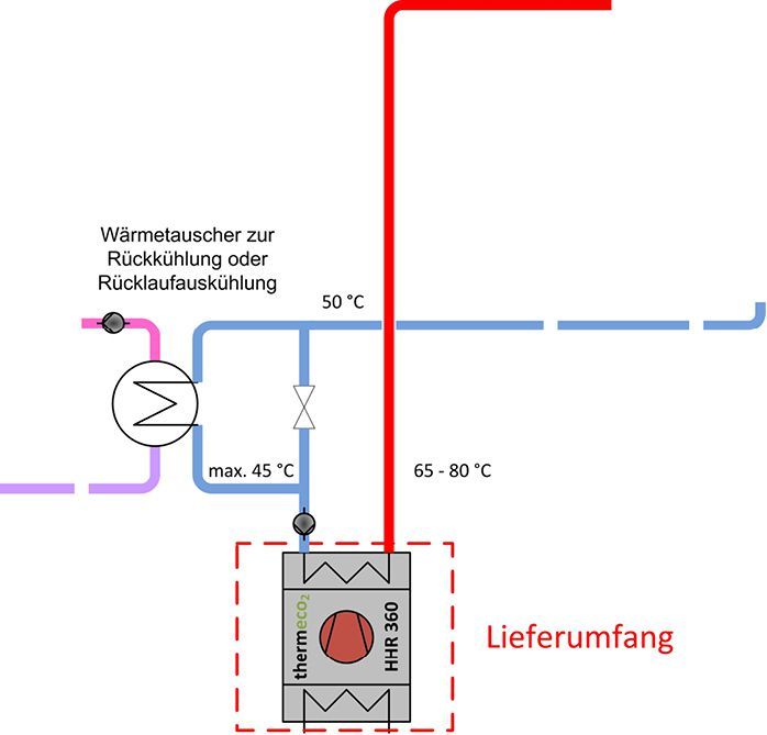- Bei sinkender Rücklauftemperatur vollständige Wärmenutzung im Heizsystem und keine Belastung des Rückkühlwerkes. Niedrige Rücklauftemperaturen sind generell anzustreben (geringere Pumpenleistung, geringere Wärmeverluste)