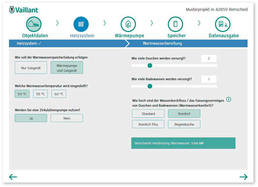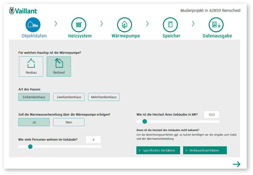 Typisches Beispiel dafür ist das Wärmepumpen-Schnellauslegungstool von Vaillant. Die Bedienung des Tools an sich ist in jeder Form grafisch aufgebaut, sodass die Eingabe der benötigten Daten ohne großen Zeitaufwand zügig umgesetzt werden kann. Das Ergebnis ist in jedem Fall die konkrete Empfehlung für ein Wärmepumpensystem inklusive des bzw. der benötigten Speicher etc. Kann oder soll kein monovalenter bzw. monoenergetischer Wärmepumpen-Betrieb erfolgen, beispielsweise wenn bereits ein Gasheizgerät installiert ist, das auch weiterhin arbeiten soll, kann das ebenfalls in den Daten eingepflegt werden.