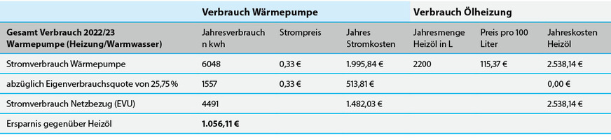 Mit der Ölheizung lag der Jahres-Heizölverbrauch bei durchschnittlich 2200 l. Bei einem beispielhaften Heizölpreis von 115,37 € / 100 l ergibt das einen jährlichen Heizkostenpreis von 2538 Euro. Der Jahresverbrauch der Wärmepumpe (Heizung und Warmwasser) lag bei 6048 kWh, wozu die PV-Anlage 1557 kWh und damit knapp 28 Prozent beisteuerte.