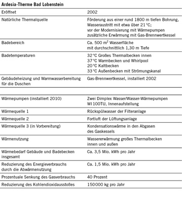 Zunächst ging die Wärmerückgewinnung aus der Abluft und dem Rückspülwasser in Betrieb. Schon sie allein konnte den Erdgasverbrauch der Therme um etwa 40 Prozent reduzieren. Statt der früheren 3,5 Mio. kWh pro Jahr wird nach den vorab vorgenommenen Wirtschaftlichkeitsberechnungen jetzt nur noch Erdgas von ca. 2,0 Mio. kWh pro Jahr benötigt. Neben dem Kostengewinn für einen wirtschaftlichen Betrieb des Bades bedeutet dies für die Umwelt auch eine Reduzierung des Kohlendioxidausstoßes von bis zu 150 000 kg jährlich.