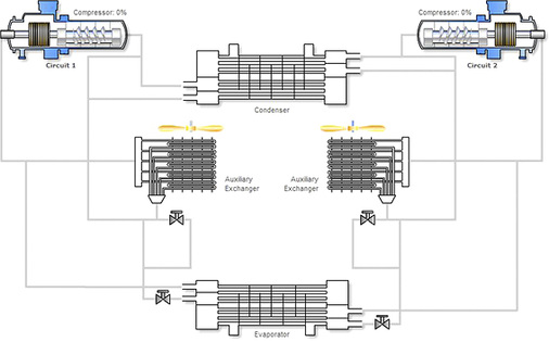 Je nach Leistungsgröße enthalten die Multifunktions-Wärmepumpen der Integra-Serie zwei bis maximal acht Scroll- bzw. zwei Schraubenverdichter. Der Einsatz mehrerer Verdichter in einem Kältekreislauf bzw. drehzahlgeregelter Verdichter hat betriebs- und regelungstechnische Vorteile. Jedes Gerät besteht aus mindestens zwei Kältemittelkreisläufen. Bei je einem Scroll-Verdichter pro Kältekreislauf sind die Leistungsstufen nicht sonderlich fein abgestimmt. Um erhöhte mechanische Belastungen zwischen den Um-schaltvorgängen bei einem unausgeglichenen Lastverhältnis zu minimieren, ist die Installation von Pufferspeichern sowohl auf der Kalt- als auch auf der Warmwasserseite sinnvoll.