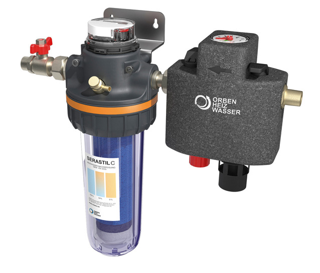 Orben stellt die Nachspeise-Einheit „Serastil C“ vor, die sich besonders für beengte Installationsumgebungen eignet. Die Wasseruhr zur Dokumentation der Ergänzungswassermenge sitzt oberhalb auf der Kartusche, wodurch eine Längeneinsparung von 184 mm erreicht wird. Die Einbaulänge der Einheit beträgt 219 mm ohne Systemtrenner und 386 mm mit Systemtrenner. Sie ist als „Uno“- oder „Duo“-Variante mit einer oder zwei Kartuschen verfügbar. Die maximale Füllleistung liegt bei 60 oder 120 l/h. Bei einer Leitfähigkeit von 420 μs/cm kann die Einheit das Ergänzungswasser auf unter 100 μs/cm aufbereiten und dabei 155 bis 230 l Wasser normgerecht behandeln. Die Variante „Serastil C ready“ kombiniert eine automatische Füllarmatur mit einer Entsalzungskartusche. Sie verfügt über einen Systemtrenner Typ BA, einen DIN-gerechten Abwasseranschluss, Absperrventile sowie einen Druckminderer und ein Doppelmanometer, das den Eingangs- und Ausgangsdruck anzeigt und zur Fehlersuche dient. Die Nachspeise-Kartuschen enthalten ein Hochleistungs-Mischbettharz, das seine Farbe von blau zu braun ändert, wenn es erschöpft ist. Verbrauchte Kartuschen können gesammelt und zur Regeneration an Orben zurückgesandt werden. Die Wiederaufbereitung erfolgt in der firmeneigenen Regenerierstation.